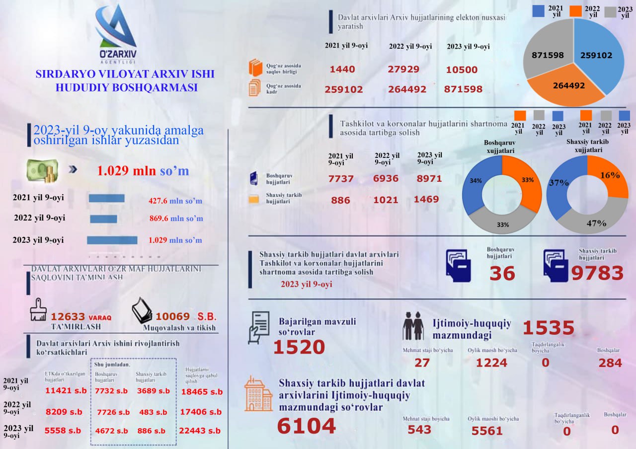 Sirdaryo viloyat arxiv ishi hududiy boshqarmasi tizimidagi arxiv muassasalari tomonidan 2023-yil 9 oyligida amalga oshirilgan ishlarning qisqacha axboroti infografik ko‘rinishda.