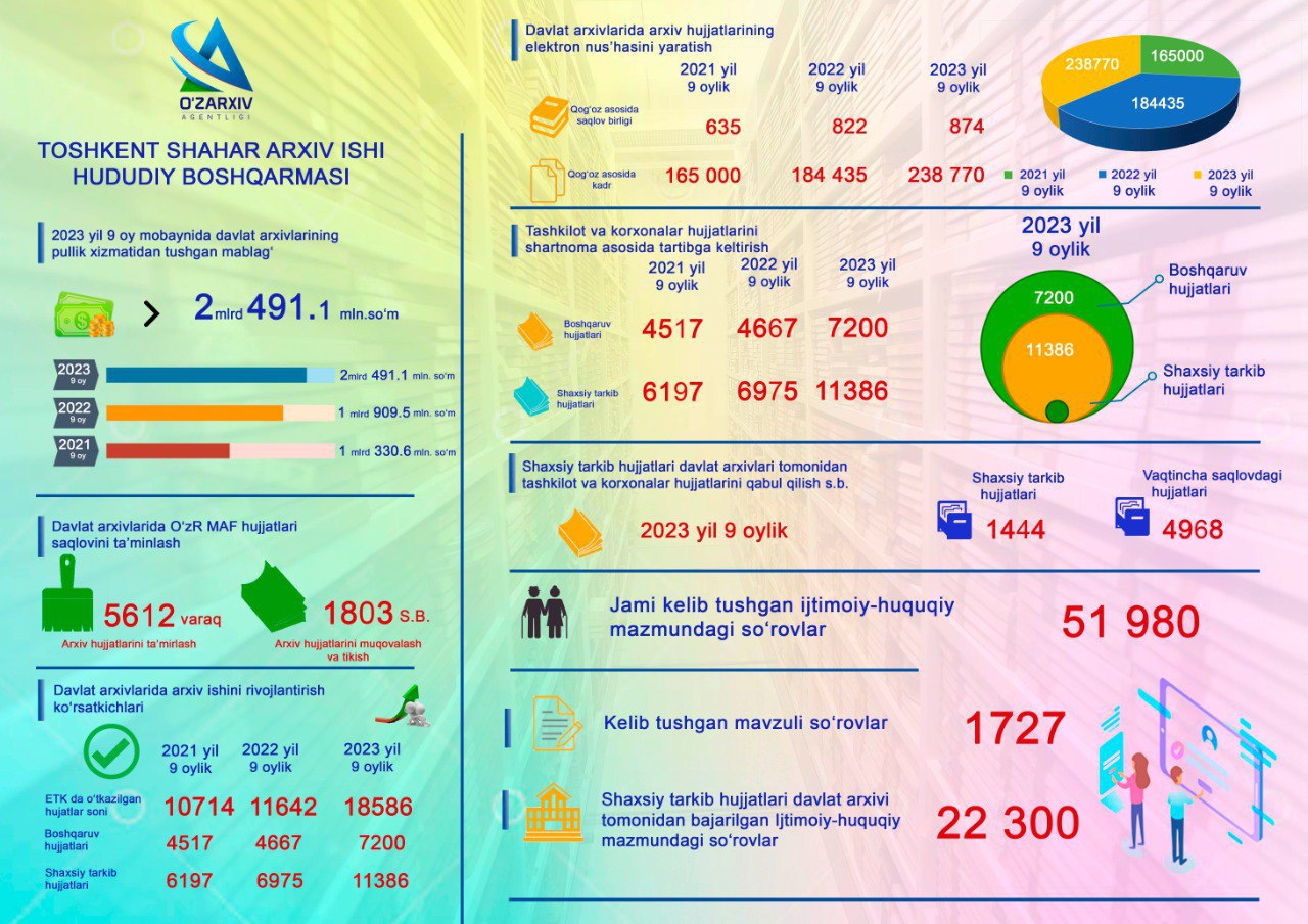 Toshkent shahar arxiv ishi hududiy boshqarmasi tizimidagi arxiv muassasalari tomonidan 2023-yil 9 oyligida amalga oshirilgan ishlarning qisqacha axboroti infografik ko‘rinishda.